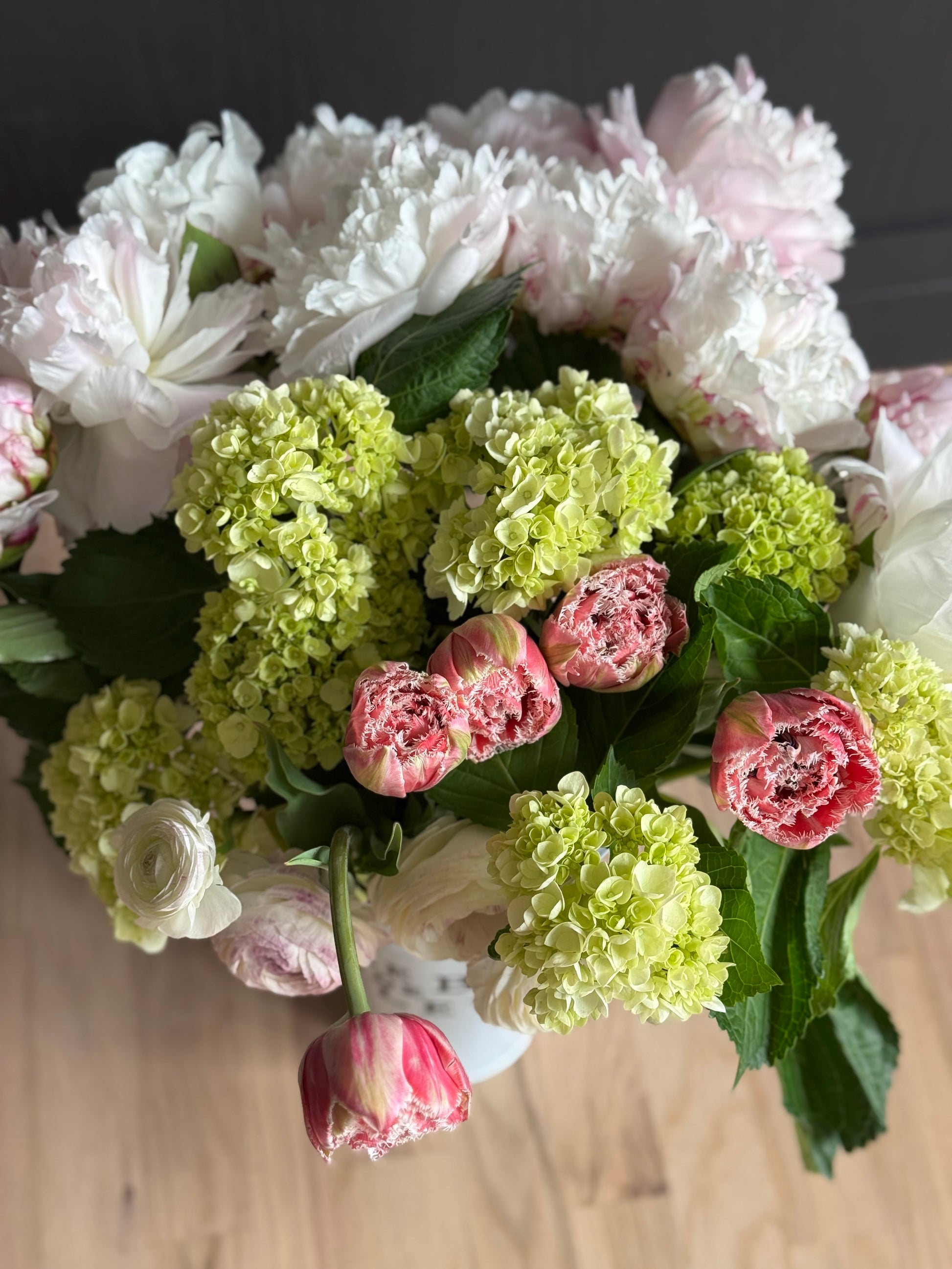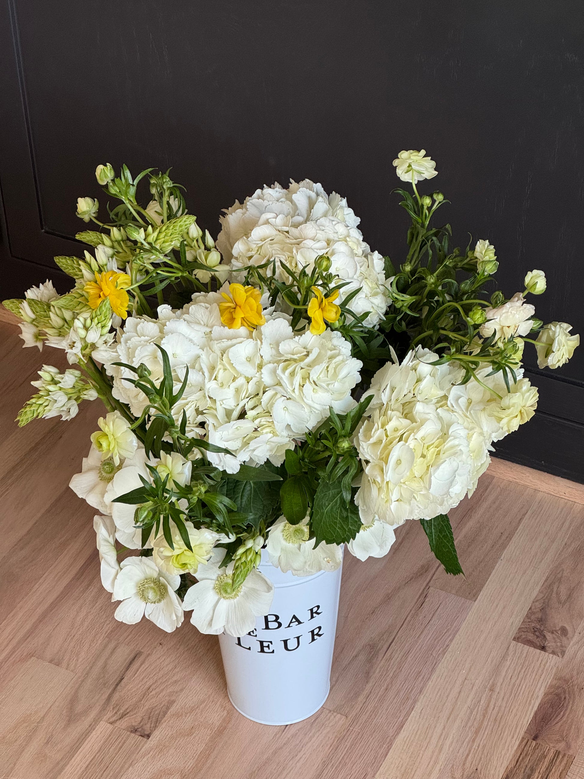 Receive an exciting new variation of flowers as often as each week in our Garden Mix pallet; a mix of the season’s most gorgeous green and white flowers, with a pop of color – changing each week. Our buckets feature the season's freshest florals, such as tulips, roses, ranunculus, anemone, hydrangea, hellebores & beyond sourced from all corners of the world. Select your size and frequency and receive a bucket of freshly cut flowers, ready to arrange.