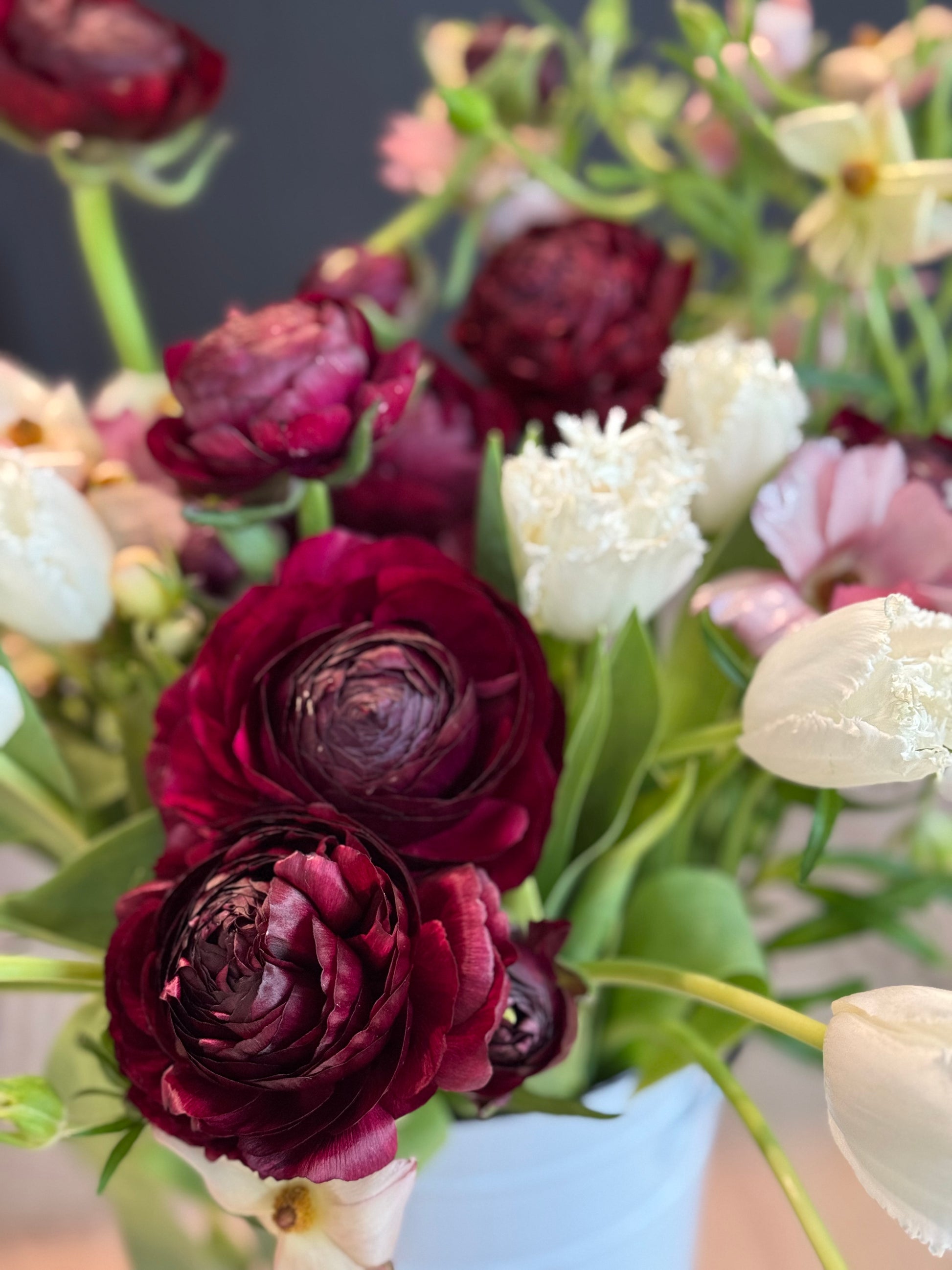 Receive an exciting new variation of flowers as often as each week in our Lauren pallet – a curated mix of dark-colored blooms with an occasional hint of green and white. Our buckets feature the season's freshest florals, such as tulips, roses, ranunculus, anemone, hydrangea, hellebores & beyond sourced from all corners of the world. Select your size and frequency and receive a bucket of freshly cut flowers, ready to arrange.